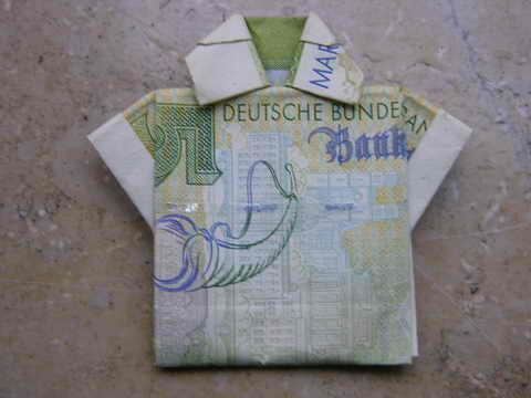 Das letzte Hemd. Wie heissen gleich nochmal diese japanischen Papierfaltkünstler? Bei wem Sie sich das wohl abgekuckt hat? Ironischerweise ist auf dem alten 5 Markschein ein Füllhorn abgebildet, das Sie einem auf den Bauch hingeknickst hat. Der Kragen ist schon etwas angeschmutzt. Mann sollte weniger rauchen, damit das Teilchen nicht so vergilbt. Füllhorn! Streue deine Wohltaten auf Mannes neue Wege!